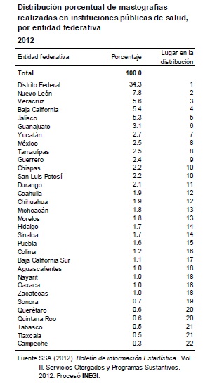 Durante 2012, las entidades que realizaron el mayor número de mastografías en instituciones de salud públicas son el Distrito Federal (34.3%), Nuevo León (7.8%) y Veracruz (5.6%), mientras que en el otro extremo se encuentran Tabasco, Tlaxcala (0.5% cada una) y Campeche (0.3 por ciento).